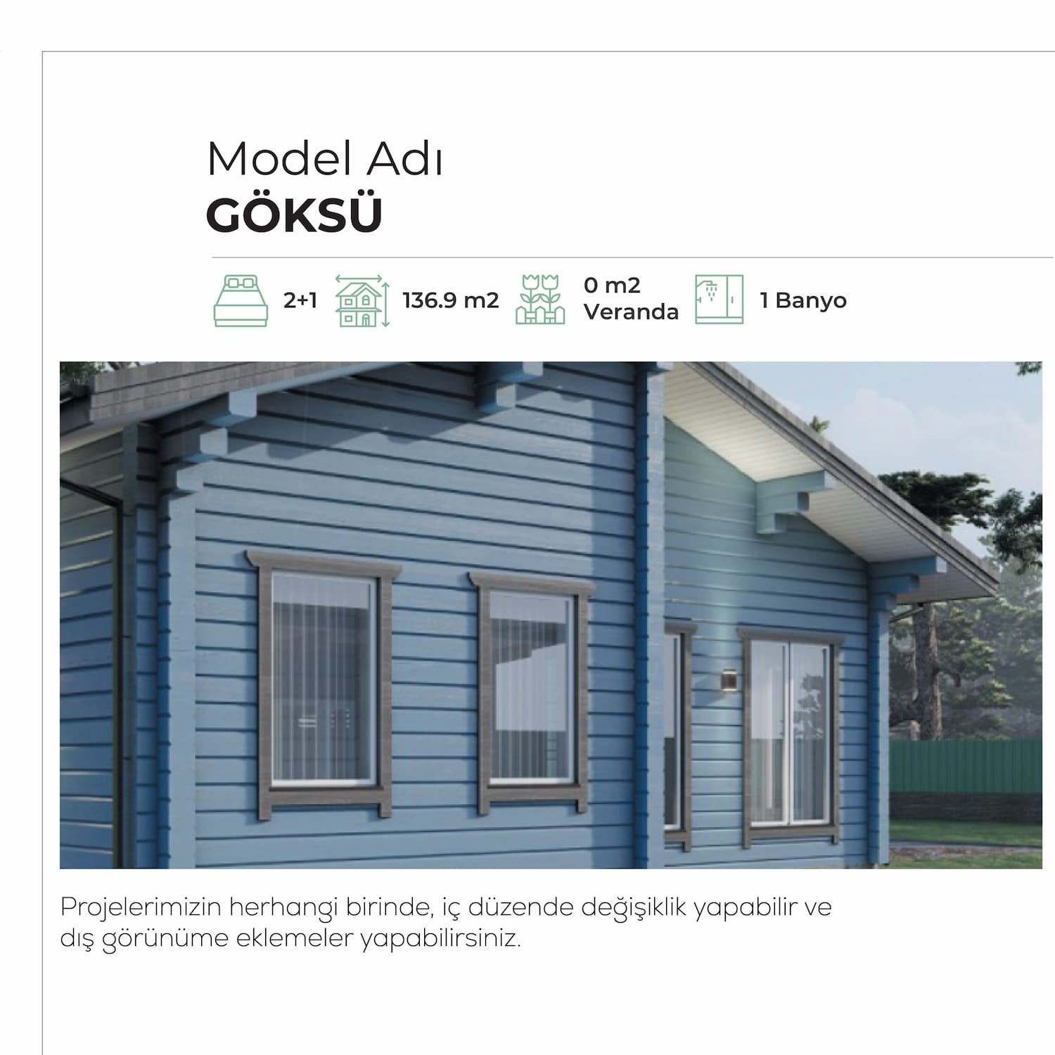 Projelerimizin tümünde iç düzende değişiklik ya da dış görünüme eklemeler talep edebilirsiniz. Hayalinizdeki ahşap eve kavuşmak için bizlere 444 0 249 numarasından ulaşabilirsiniz.