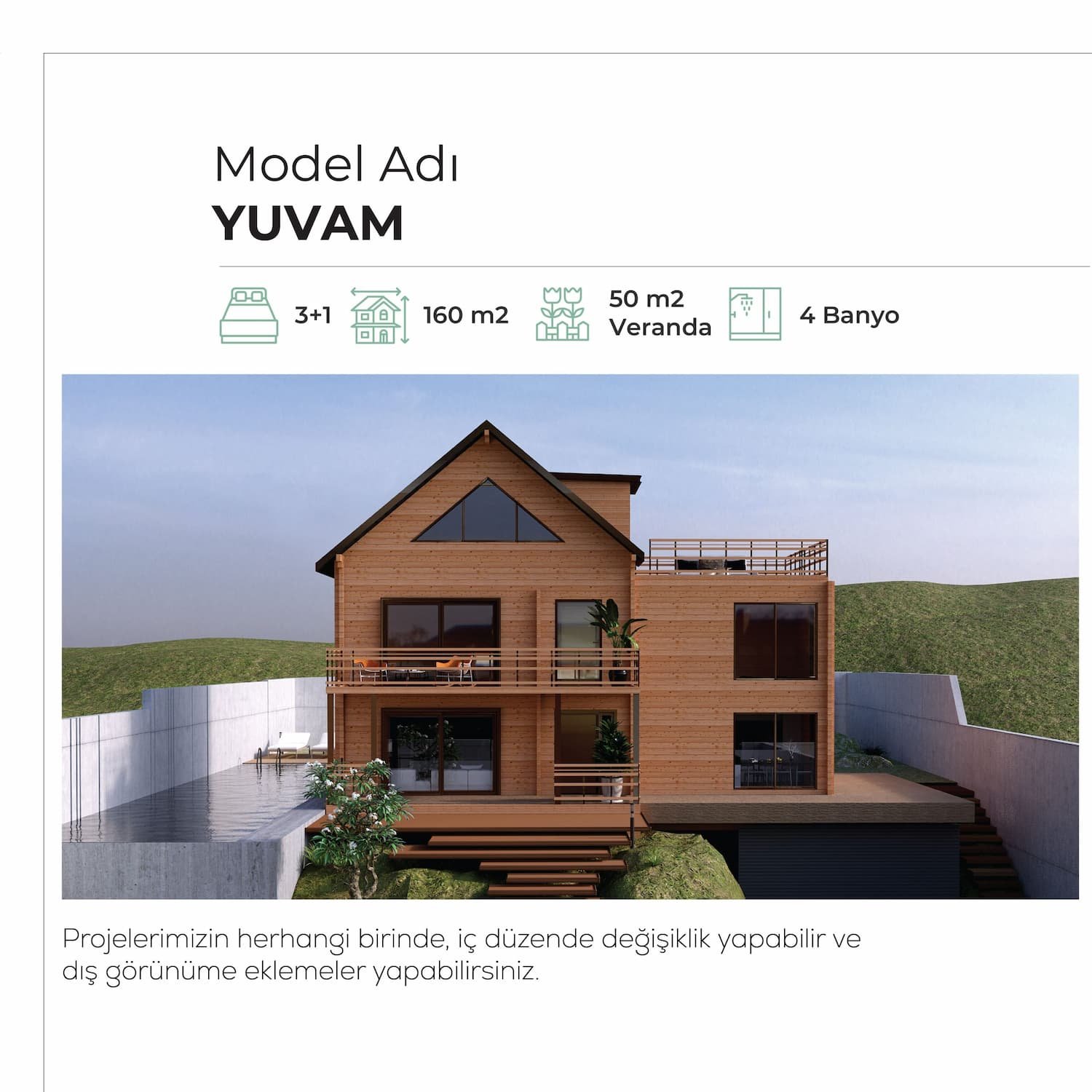 Projelerimizin tümünde iç düzende değişiklik ya da dış görünüme eklemeler talep edebilirsiniz. Hayalinizdeki ahşap eve kavuşmak için bizlere 444 0 249 numarasından ulaşabilirsiniz.
